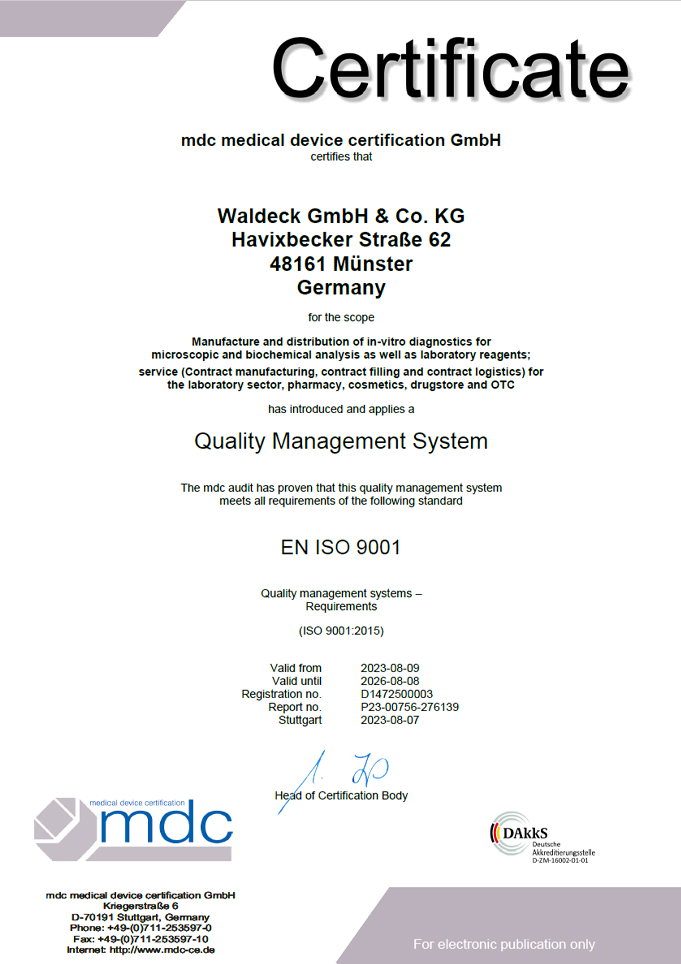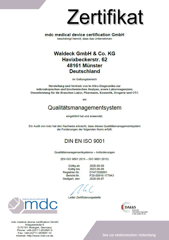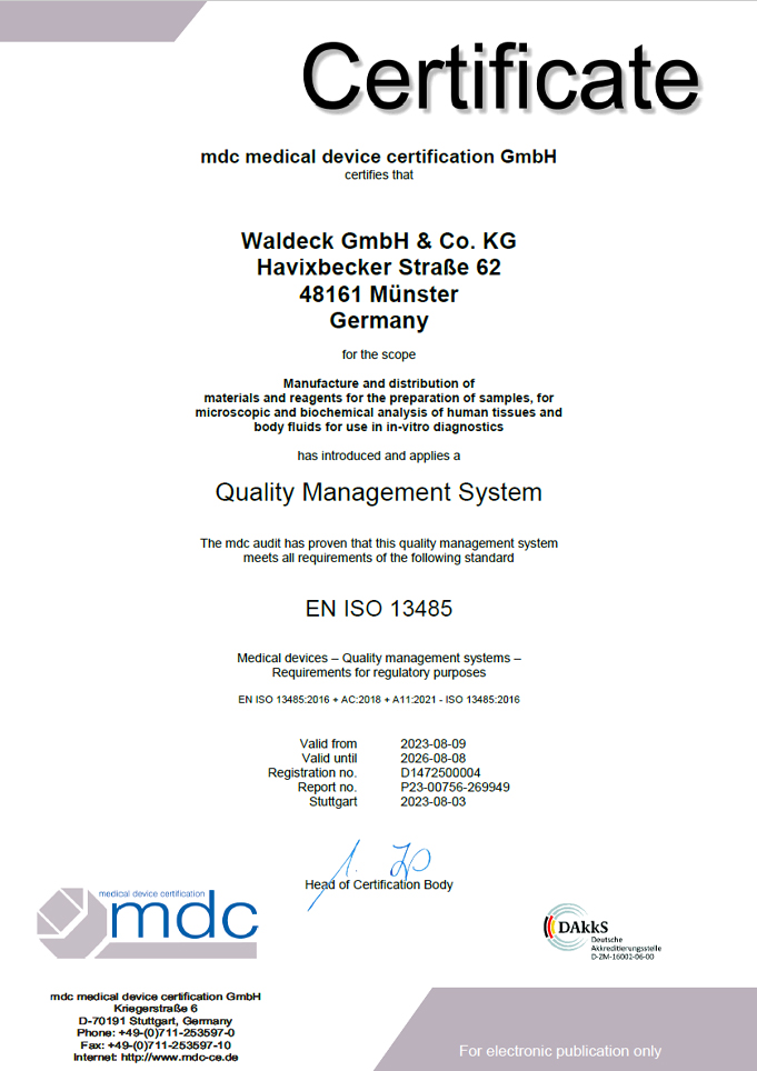 The regular certification of our business activities creates trust. Trust that we have in our suppliers and that our partners have in us. That is why, since 1995, we have been certified in compliance with DIN EN ISO 9001 et seq., and in compliance with the specifications of DIN EN ISO 13485 since 2011.