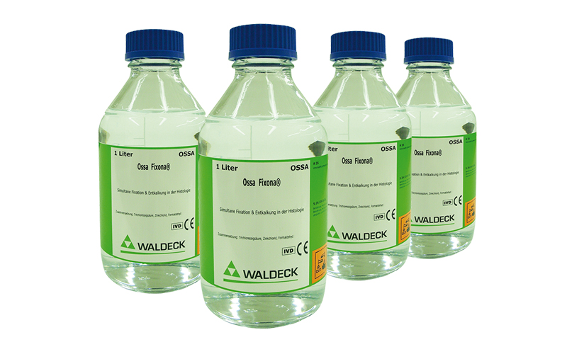 Ossa Fixona® ist eine simultan, schnell und schonend wirkende Fixier- und Entkalkungs-Lösung für histologische Knochenuntersuchungen. Die Dauer der Entkalkung steht in Abhängigkeit zur Schichtdicke des Probenmaterials.